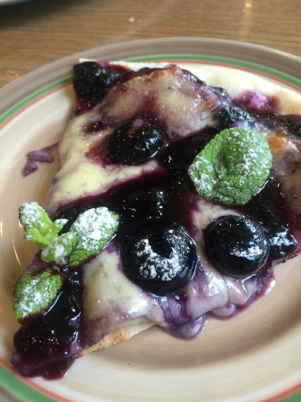ブルーベリーコンフィチュールの甘味と、ゴルゴンゾーラチーズの塩味が組み合わさって、ココロもとろけてしまいそうな美味しさ。大粒のブルーベリーが満足感たっぷりの触感。アップルミントがピザの甘しょっぱさに爽やかさを加えてくれるのが、またまたお洒落。