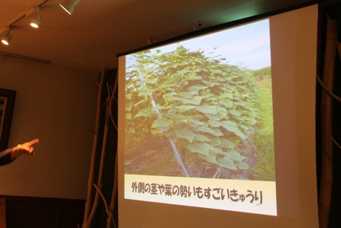 「私は農家でもないし、農業のプロでもないけれど、EMさんにお願いすると、こんなすごいキュウリができるんです!」と野本さん。