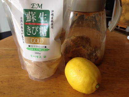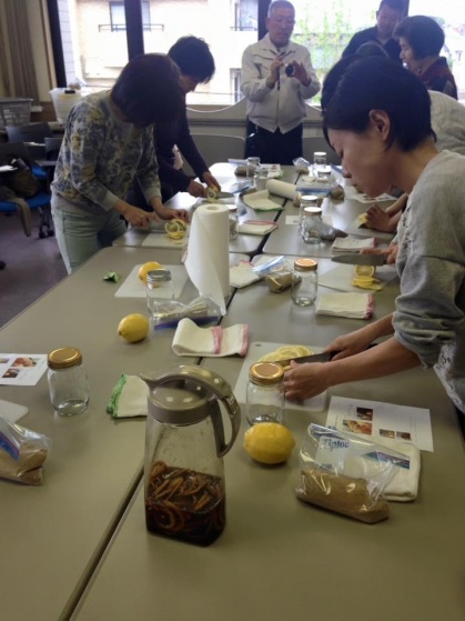 伊藤さんからレモンのお話を聞いた後は、みんなで「レモンシロップ」づくり。伊藤さんのレモンと、EM蘇生きび糖GOLDを1:1の割合で混ぜ、1週間置いておきます。