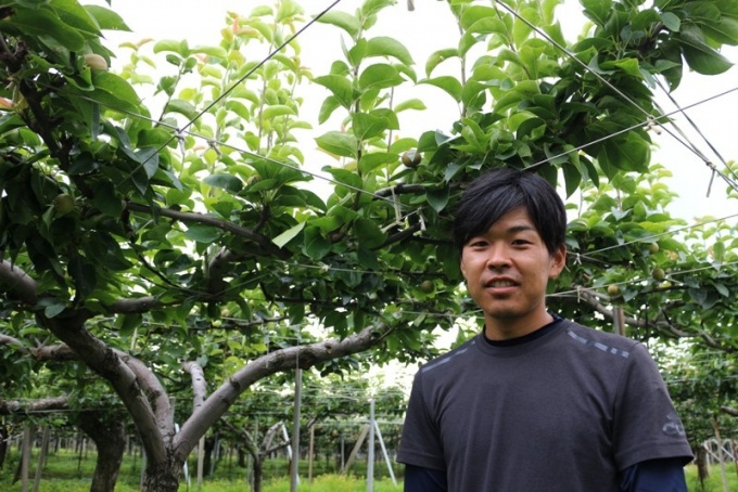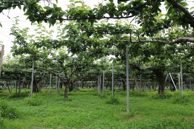 梨の畑に一歩足を踏み入れると、ツヤツヤの枝がきれいに横に伸びた緑の屋根がどこまでも続いています。