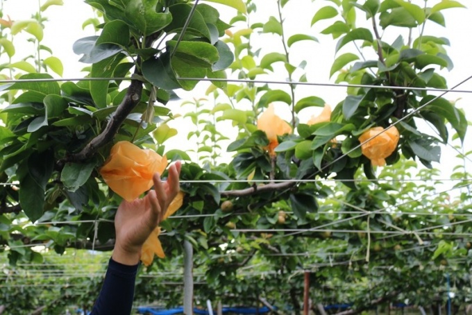 ピンポン玉サイズのかわいい梨に袋をかけます。
