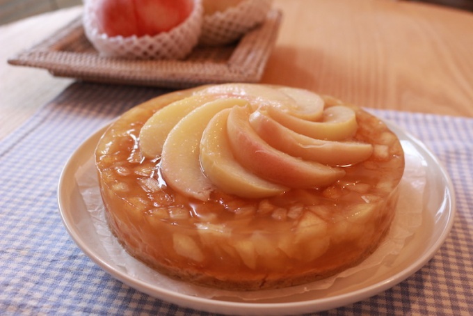 ゼリータルトの上に適量のせて、もものコンポートを円形に飾る。