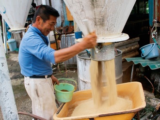 「この飼料はね、飼料屋さんにお願して薬を抜いた状態で配合してもらっているんだよ。他の豚屋さんのものと別に作らないといけないから、めんどくさがられているけどね(苦笑)。ホルモン剤を入れていないから、半年で一気に成長する一般的な飼育よりも、出荷まで1~2ヶ月程長くかかるし、その分、エサ代も余計にかかってしまう。でも、それが本来の豚の成長スピードなんだし、なにより、自分が食べられるもので豚達も育てたいから」